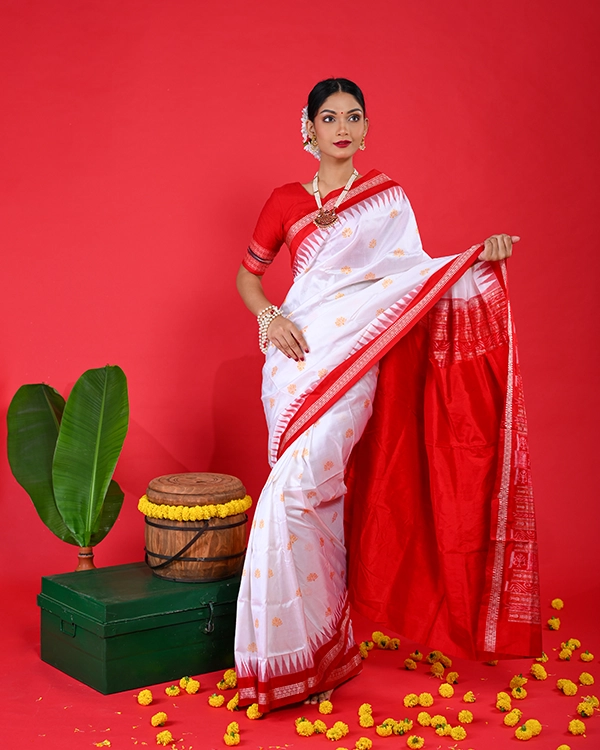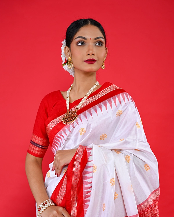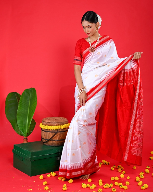 Discover the pinnacle of Odisha’s weaving artistry in this exquisite Bomkai silk saree, meticulously handwoven from 100% pure silk for a luxuriously soft and lustrous drape. The pristine white body serves as a canvas for intricate traditional motifs, masterfully contrasted by a vibrant red border and pallu that evoke timeless festive elegance. Ideal for weddings, pujas, and cultural celebrations, its classic red-and-white palette radiates purity and joy.