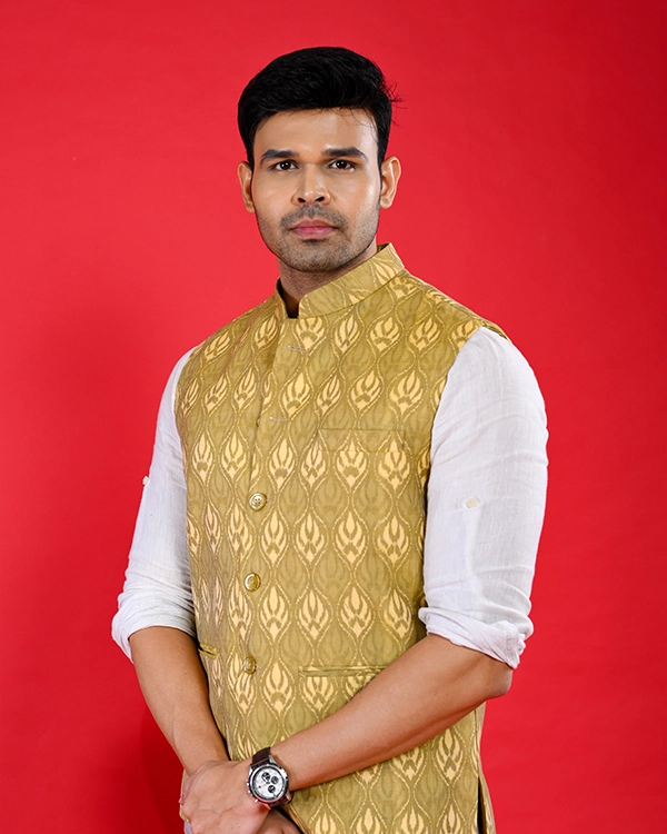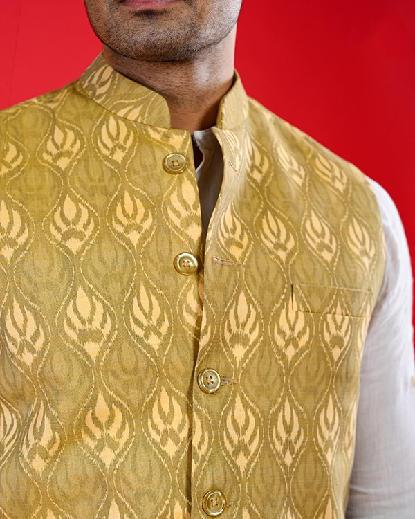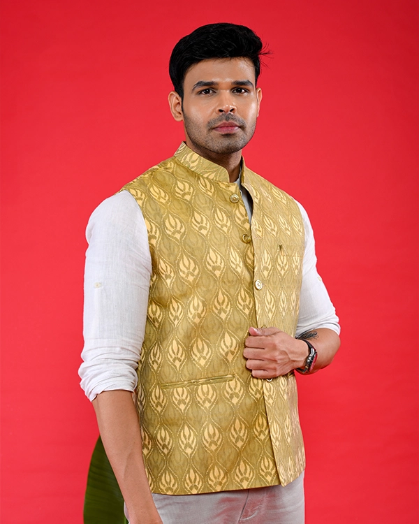 Add a touch of regal sophistication to your ethnic wardrobe with this handwoven cotton Bundi jacket, masterfully crafted to showcase traditional artistry in a striking golden hue. The fine cotton fabric features intricate woven motifs that reflect skilled craftsmanship, offering a lightweight drape with a modern, tailored silhouette and classic button closure. Ideal for elevating kurtas, shirts, or fusion outfits, it shines at weddings, festivals, and cultural events.