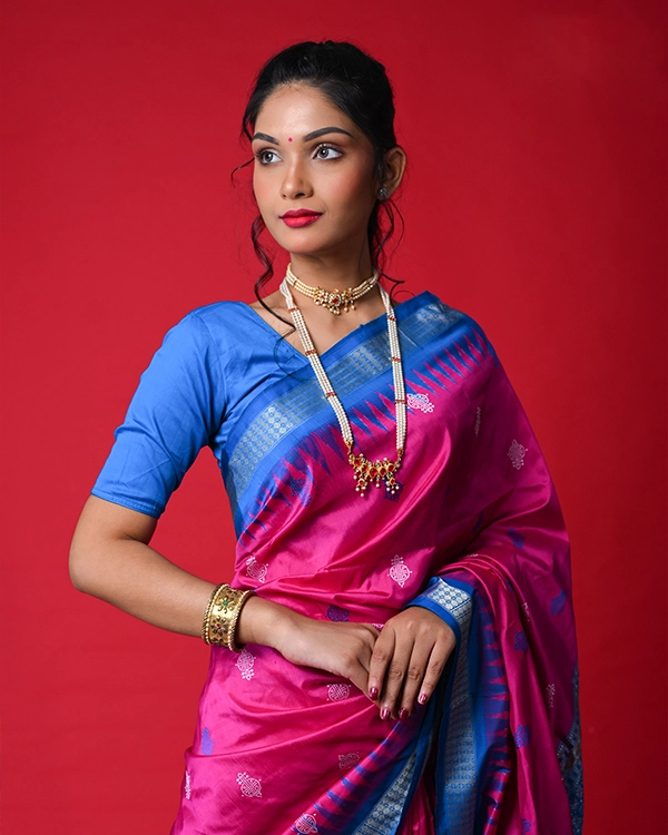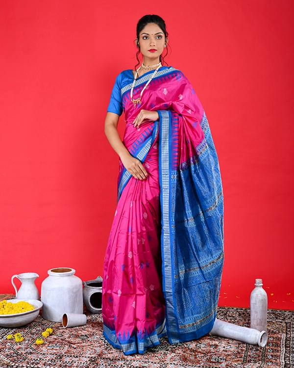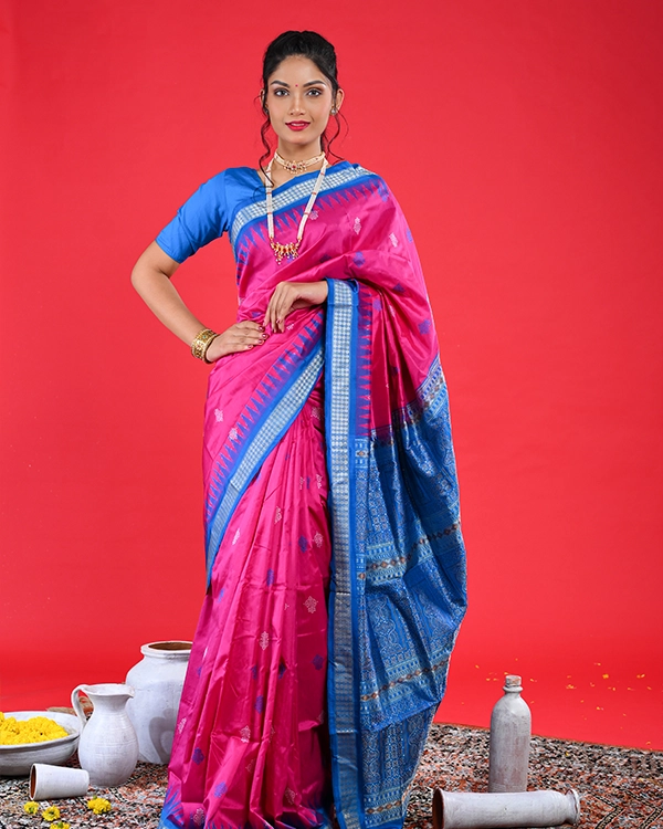 Celebrate Odisha’s masterful weaving heritage with this exquisite handwoven silk Bomkai saree, where a rich magenta body meets a striking royal blue border and pallu for a captivating color contrast. Intricate traditional motifs, woven directly into the lustrous pure silk fabric, add depth and festive charm, making it an ideal choice for weddings, cultural gatherings, and opulent celebrations.